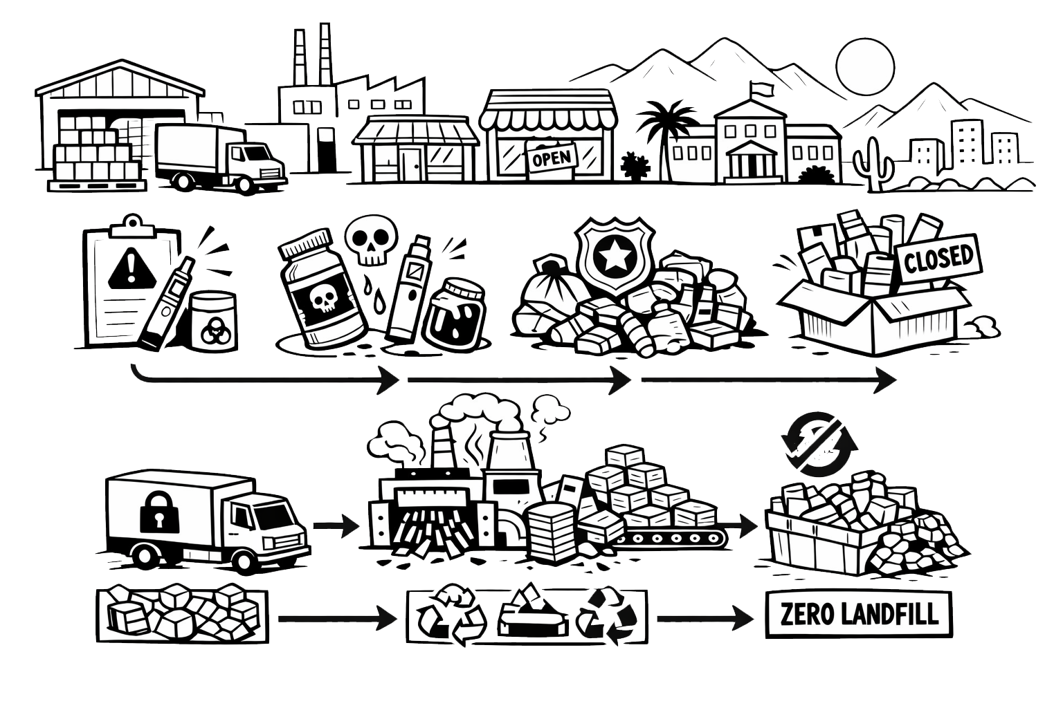 Large volumes? At this time, we focus ONLY on household vape waste. We DO NOT handle recalls, expirations, damages, confiscations, or overstock for manufacturers, distributors, retailers, schools, and institutions in Phoenix/Mesa.